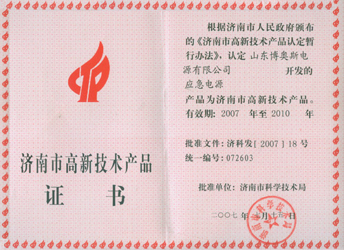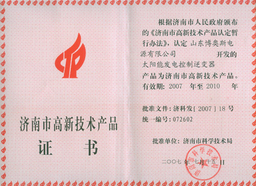 濟南市高新技術產(chǎn)品證書