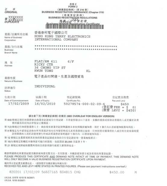 香港泰利電子國(guó)際有限公司營(yíng)業(yè)執(zhí)照