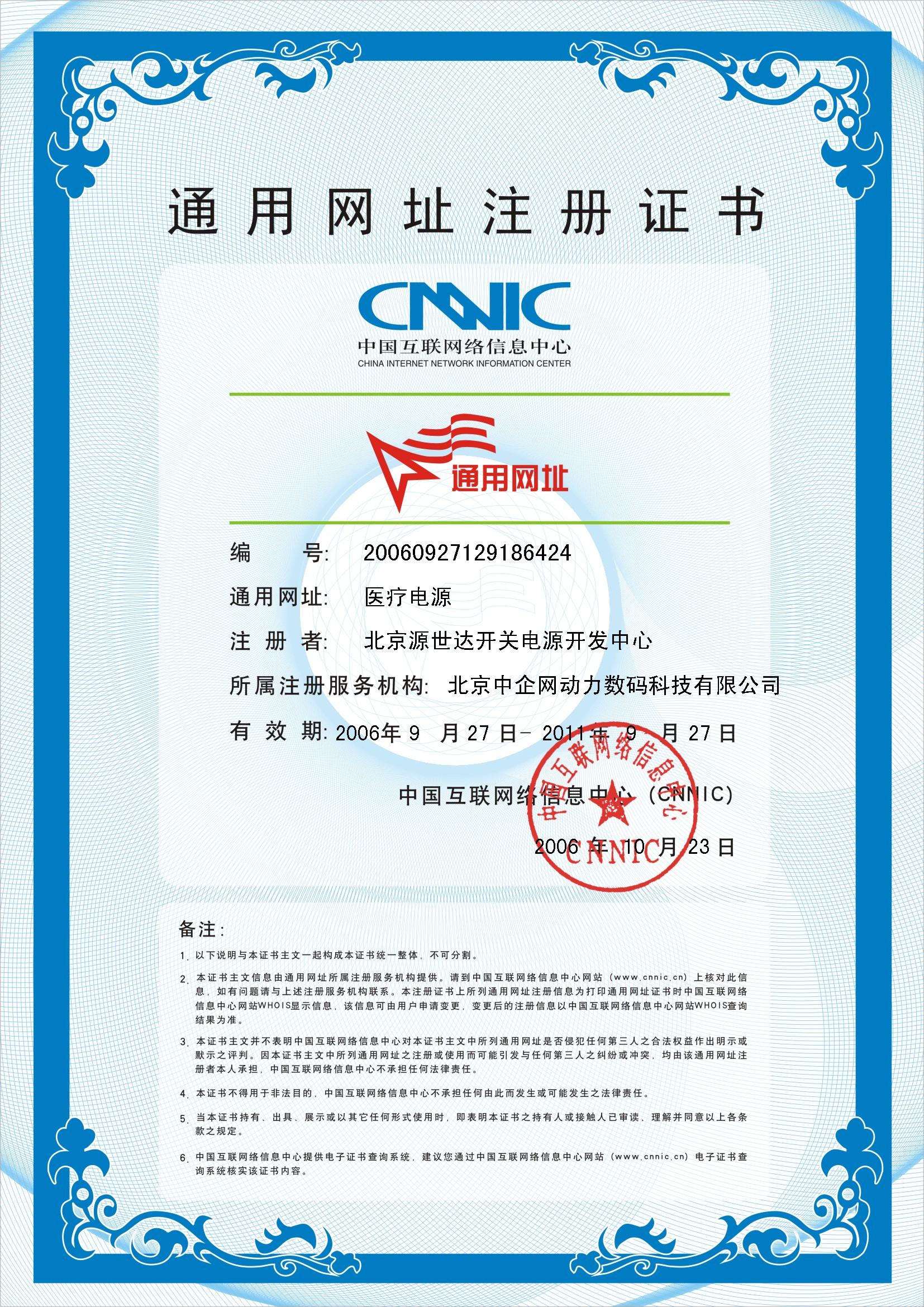 通用網(wǎng)址(醫(yī)用電源)注冊證書