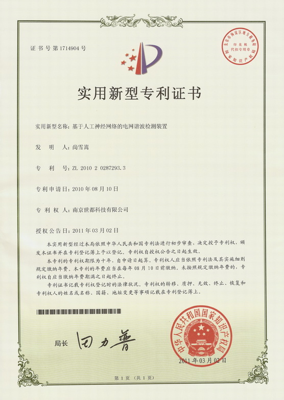 諧波神經(jīng)新型專利證書