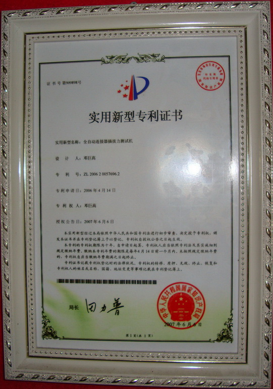 實(shí)用新型專利產(chǎn)品證書-連接器插拔力試驗(yàn)機(jī)