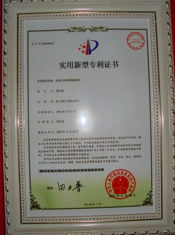 實(shí)用新型專利產(chǎn)品證書-按鍵開關(guān)荷重行程曲線機(jī)