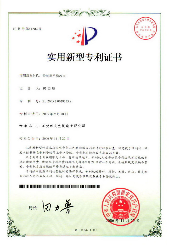 大陸實(shí)用新型專利證書
