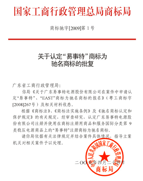 易事特榮獲中國(guó)質(zhì)量免檢商標(biāo)