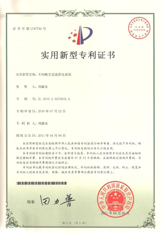 不間斷交直流供電系統(tǒng)專利證書